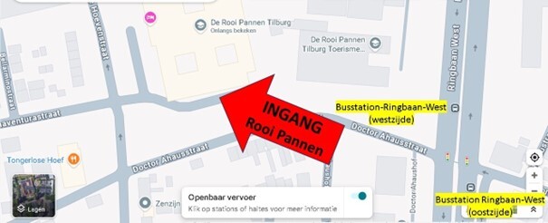 Ons nieuwe onderkomen is ook bijzonder goed met het openbaar vervoer bereikbaar. Op de Ringbaan West bevinden zich twee busstations op nog geen 5 minuten lopen van de ingang van De Rooi Pannen. Er is daar bij de bushaltes ook een veilige oversteekplaats voor voetgangers met stoplichten! Vanaf die plek loop je de Dr. Ahausstraat in tot je op de kruising met de Reitse Hoevenstraat komt. Daar ga je meteen rechtsaf en loop je via de eerste inrit aan je rechterhand het parkeerterrein van “De Rooi Pannen” op. Daar ga je via de statige ingang het gebouw binnen.