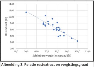 Hoe leeg is mijn bier? Grondstof ![]() Ook de gist speelt mee in het eind s.g. of het restextract. Leveranciers van gist geven gewoonlijk aan hoeveel de gist kan omzetten. Er zijn gisten die heel veel soorten suikers kunnen omzetten, dus niet alleen de simpele (glucose en maltose) maar ook de grotere. En er zijn gisten die dat niet kunnen. Leveranciers spreken van schijnbare vergistingsgraad of apparent attenuation van hun gist. Een gist met een lage vergistingsgraad zal dus een hoog eind s.g. opleveren en daarmee veel restextract, een gist met een hoge vergistingsgraad een laag eind s.g. en weinig restextract. Je kunt de schijnbare vergisting van bier uitrekenen en dat is gemakkelijk. De formule daarvoor is: Samenvatting |